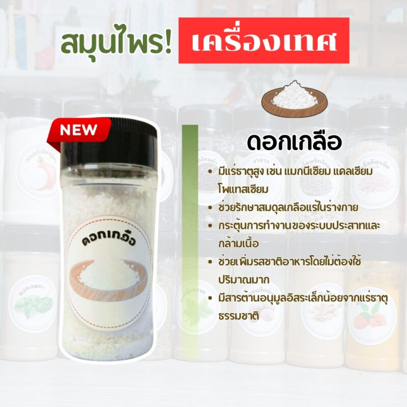 - ตกแต่งอาหาร: โรยดอกเกลือป่นบนอาหารก่อนเสิร์ฟ เพิ่มความสวยงามและน่ารับประทาน